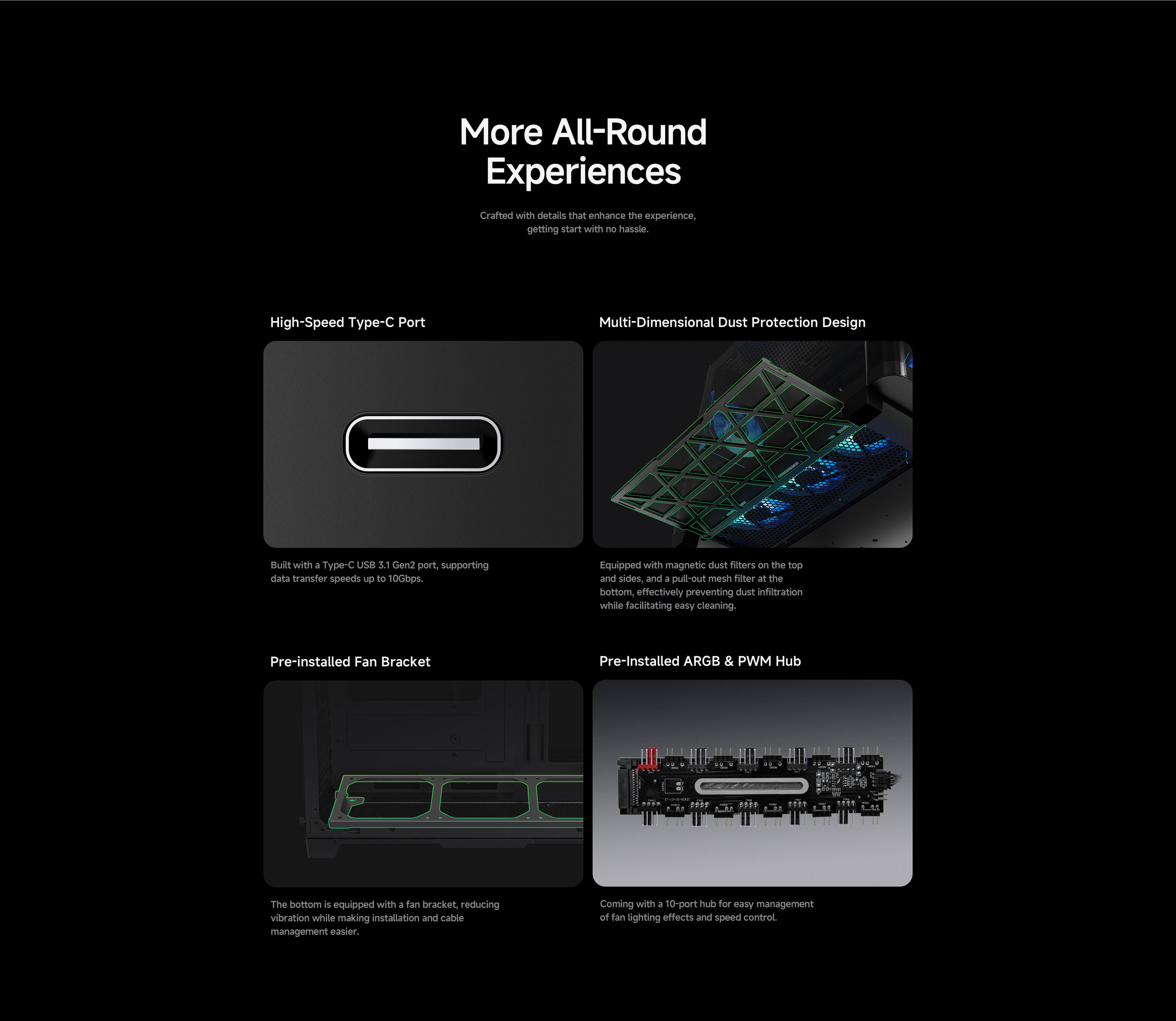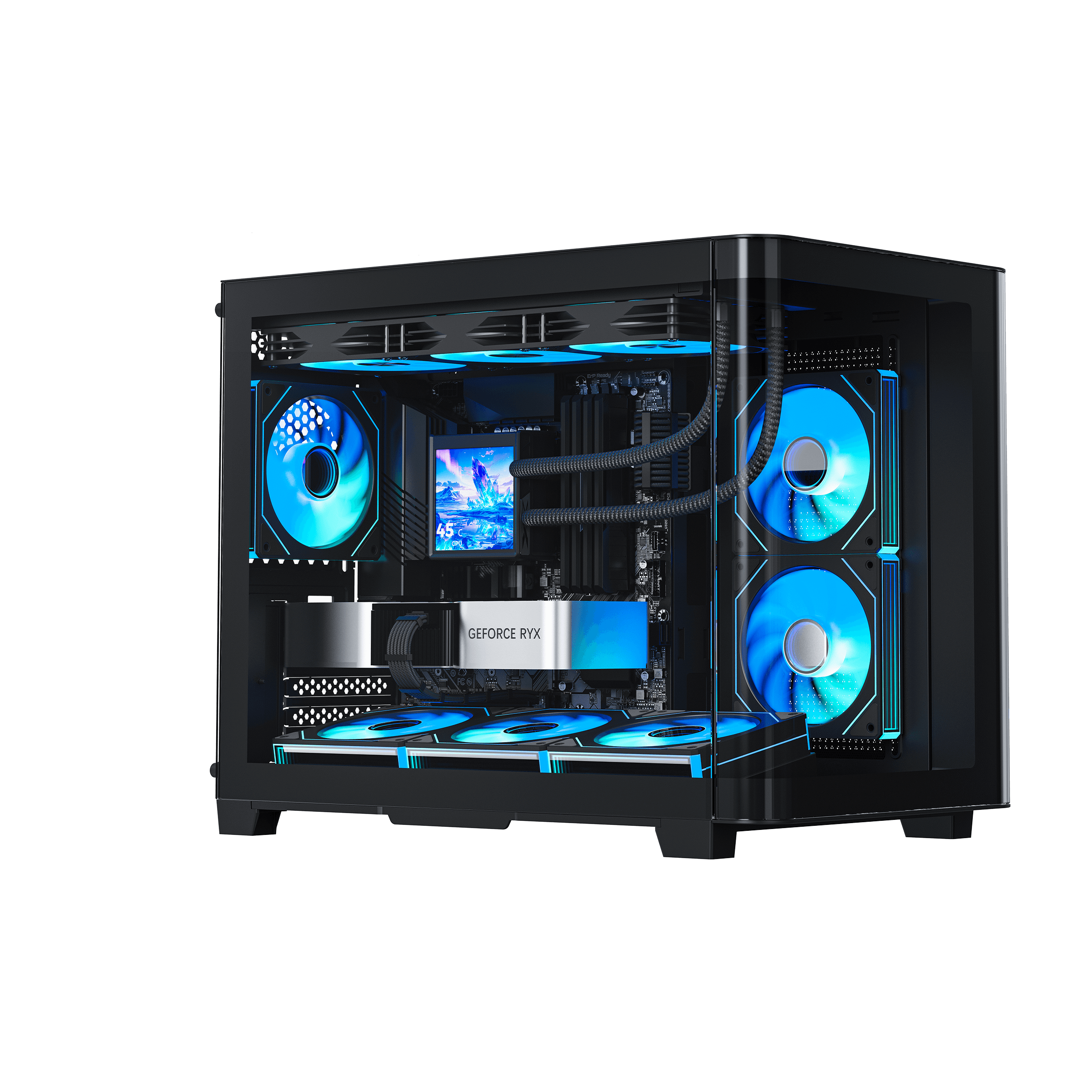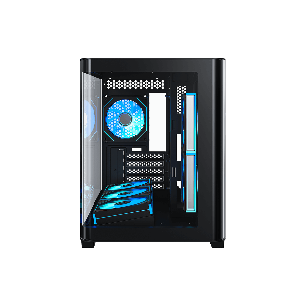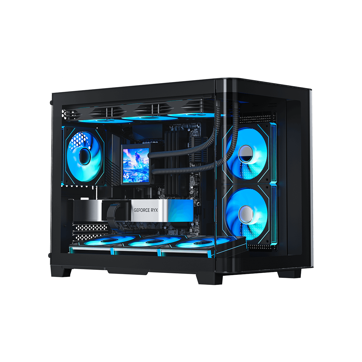 · Include pre-installed six ARGB fans and a 10-port ARGB & PWM HUB for out-of-the-box cooling and RGB lighting.