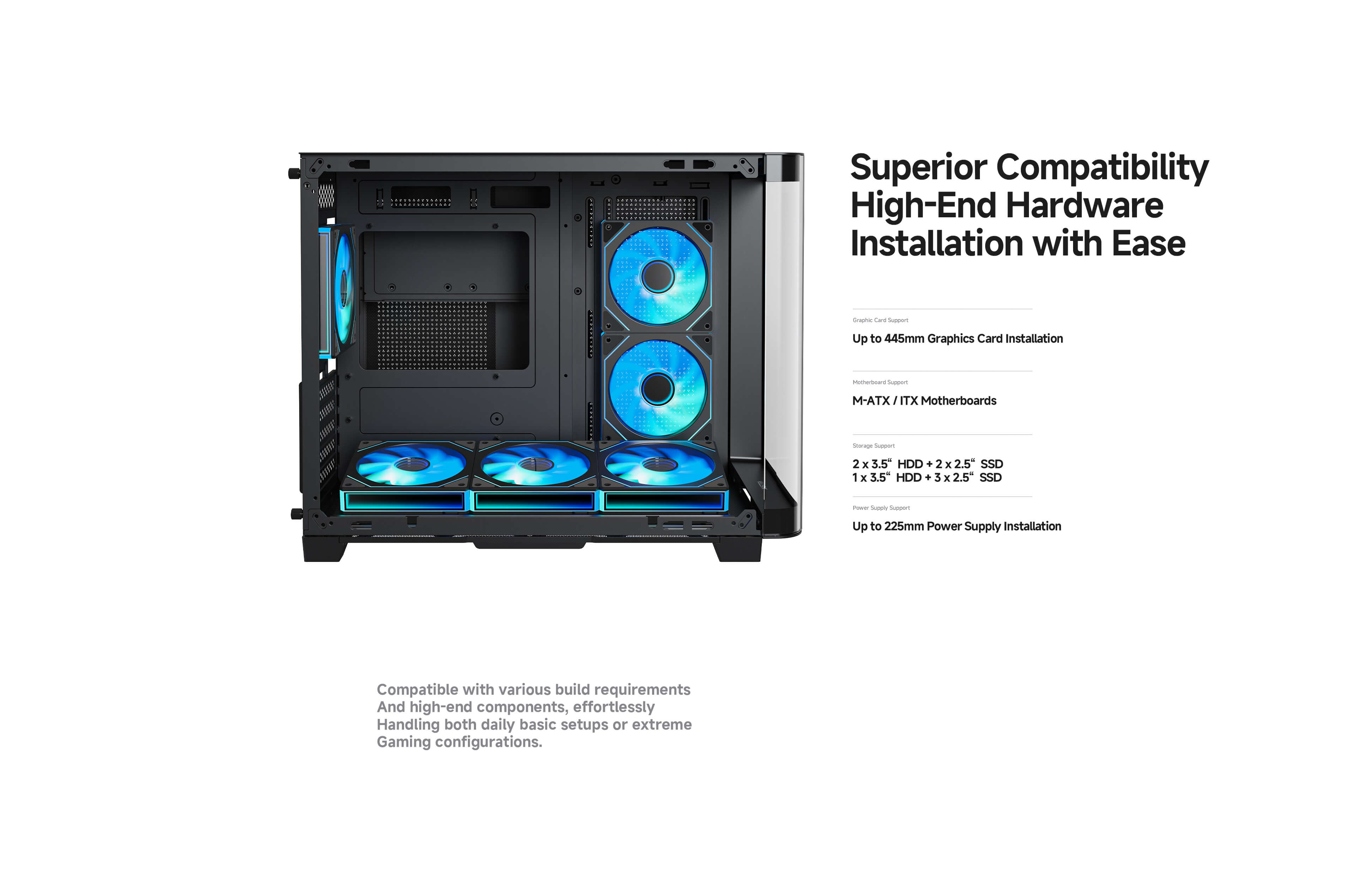 · Compatible with motherboard up to M-ATX, graphic cards up to 445mm.