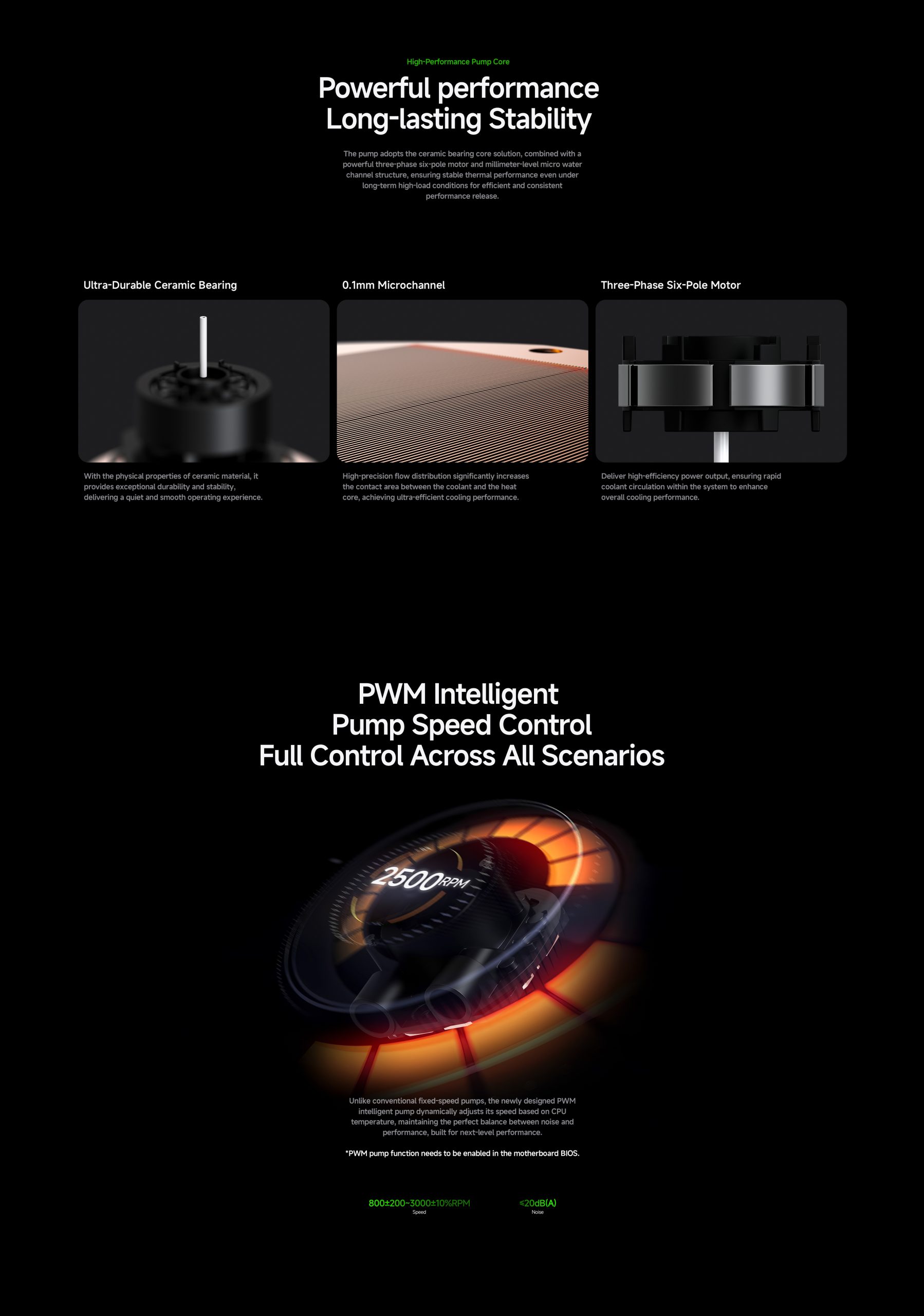 •High-performance pump with ceramic bearing, 0.1mm microchannel, three-phase six-pole motor, and PWM control function