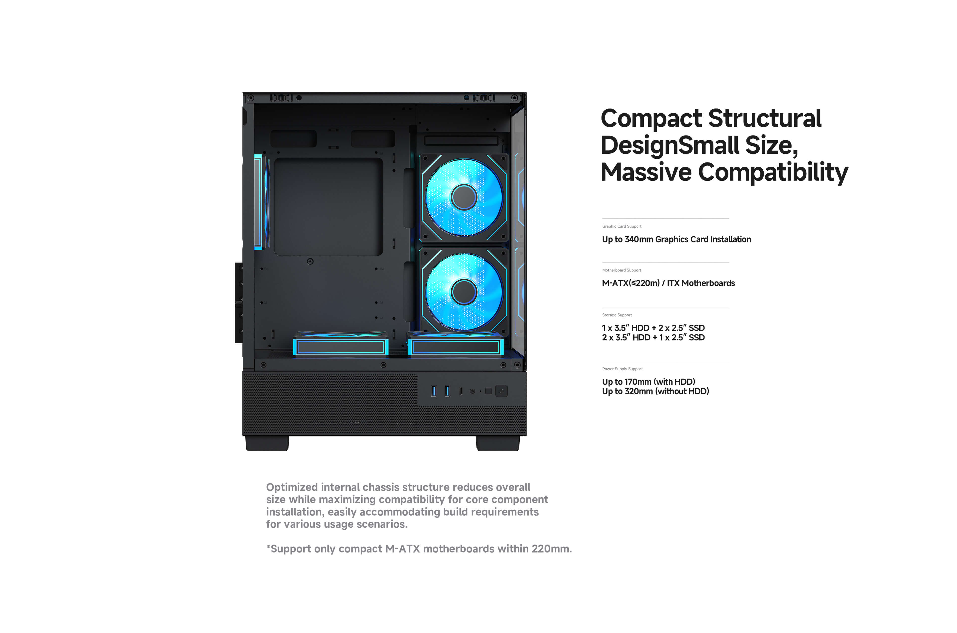 · Compact Structure: Compatible with ITX and M-ATX motherboards within 220mm, accommodating up to 340mm graphics cards.
